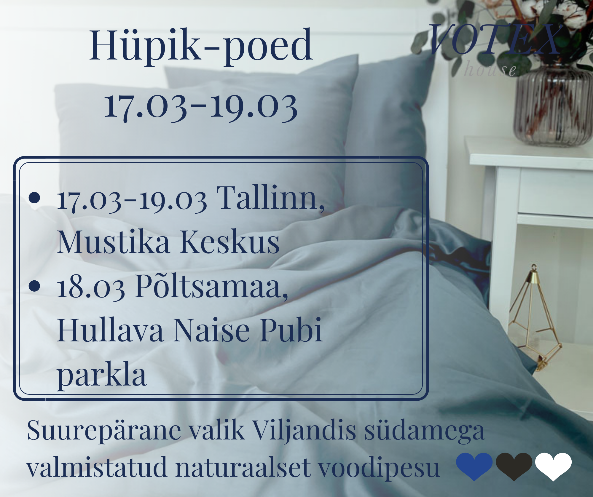 Votexil on kohting Tallinnaga ! Tallinn on meid juba ammu välja kutsunud, kuid meie oleme ju “raskesti kättesaadavad”. Nüüd andsime aga alla ja võtsime kutse vastu — Eesti parima voodipesuletid leiad sel nädalalõpul 11.03–12.03 Kristiine Keskusest (Kadri resideerub Jyski ja Matsimoka vahel) ja Stroomi Keskusest, kus võid kohata Heidit. Ootame Sind oma unekvaliteeti parandama!