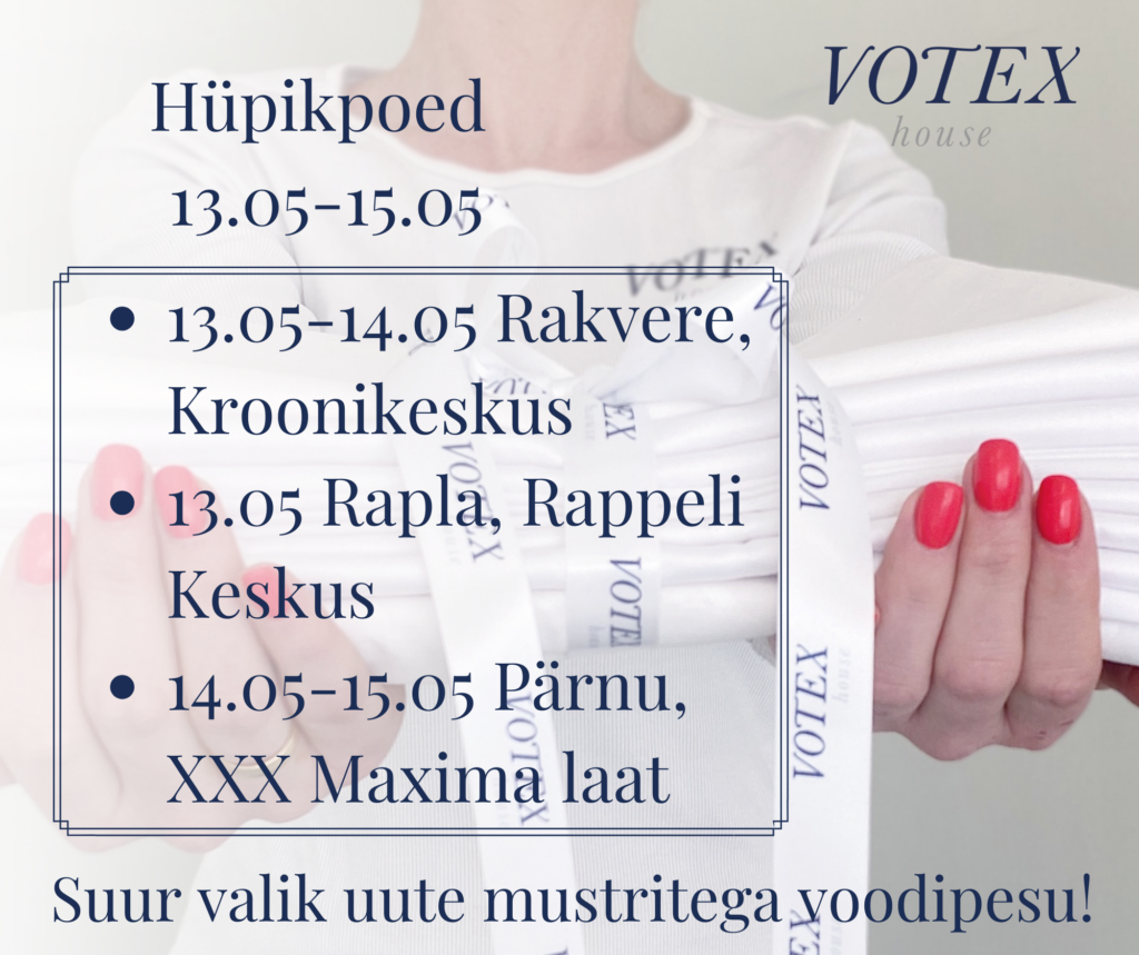 Sel nädalal alustame hüpik-poodidega neljapäevast. Oleme parima voodipesu ja pehmeimate tekkide-patjadega olemas nii Rakveres, Raplas kui ka Pärnus. Tule vaatama ja katsuma, sest oma silm on kuningas ja käsi kuninganna :).