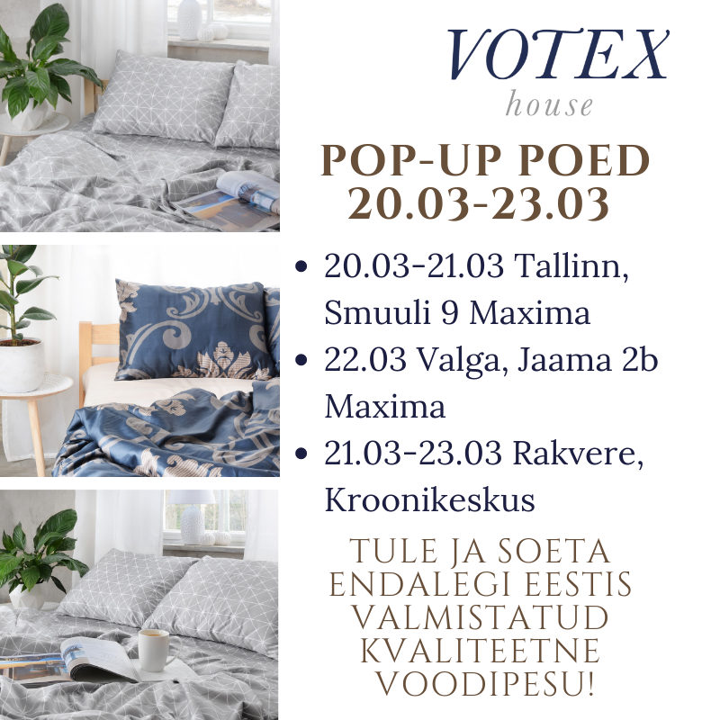 Sel nädalal rõõmustame Tallinna, Valga ja Rakvere inimesi. Suurim valik Eestis valmistatud puuvillast voodipesu ning loomulikult kevadiselt rõõmsad hinnad!