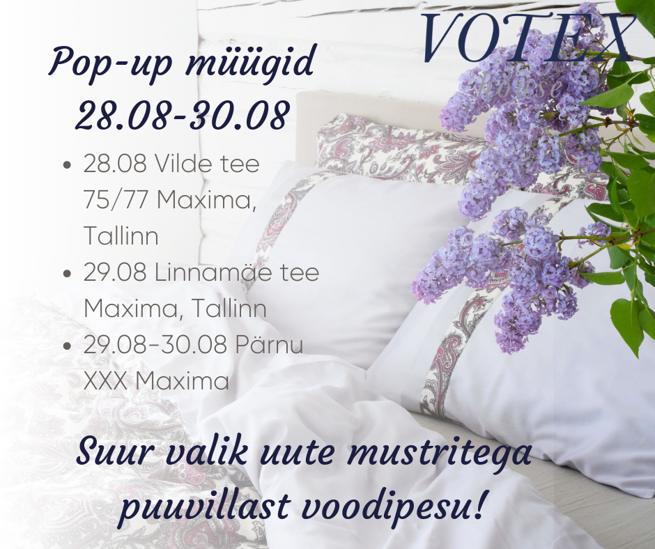 Sel nädalalõpul oleme parima voodipesuga rõõmustamas Tallinna ja Pärnu inimesi. Meil on kaasas suur valik erinevat puuvillast voodipesu ning valik puuvillasatiinist tooteid. Nagu alati, võtame kaasa rahvalemmikud — kummiga voodilinad.